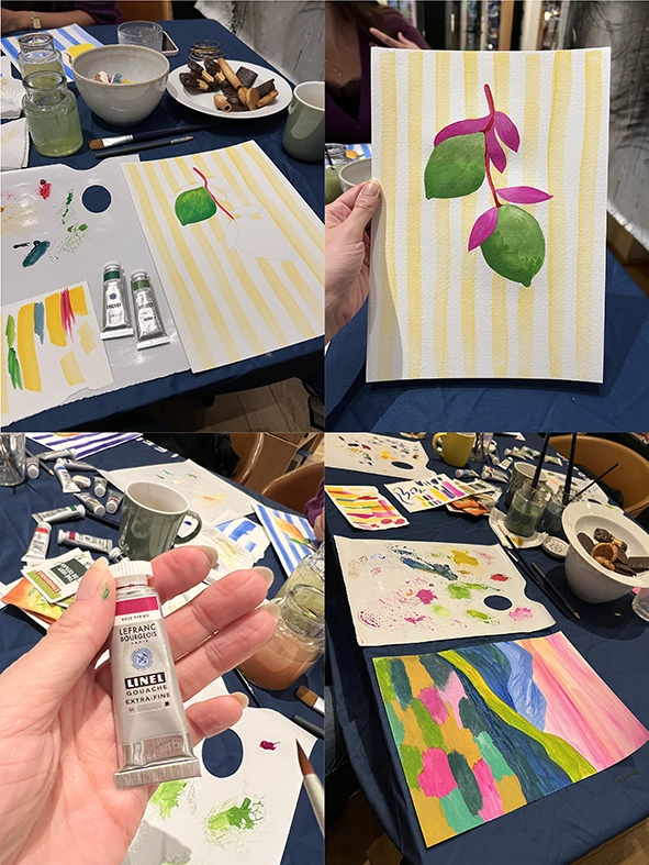 J’ai participé à l’atelier Gouache Linel proposé par Lefranc et Bourgeois dans leur merveilleuse boutique Charbonnel à côté de Notre-Dame. Nous étions 6 à profiter des conseils et des couleurs de Nolwenn Studio. Elle nous a fait découvrir la gouache Linel avec laquelle elle fait ses magnifiques paysages colorés. Nous avons profité de ses nombreux conseils tout en peignant de beaux citrons et un paysage expressif. Une soirée qui fait du bien, Marie nous accueil toujours parfaitement avec son sourire, une bonne tasse de thé et des petits gâteaux au chocolat. Le temps passe vraiment trop vite dans cette boutique !